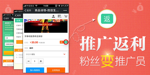微商城推廣返利功能上線,相當于微信版淘寶客功能,從此粉絲變推廣員,充分利用粉絲朋友圈推廣,商城訂單量颼颼上漲,漲粉賣貨雙管齊下,粉絲活躍度不用愁,掉粉問題也一并解決! 1、設置返利商品返利比率 商城后臺可對每一個商品設置是否進行返利推廣,且可根據商品的利潤設置返利比率。設置了返利推廣的商品將會在商品頁面的價格欄右側出現返利標志返,點擊返即