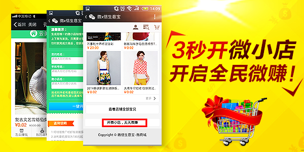 微信生意寶微小店全面來襲,開啟全民分銷時代,全民微電商浪潮一觸即發! 1、微小店滿足你微信開店的愿望,夢想成真只需3秒鐘,3秒你就能擁有自己的微小店,免進貨、零庫存、無需上寶貝、不用上下架、無需發貨、不用售后、零風險,坐享返利,躺著把錢賺。 2、微小店單店商城的營銷推廣神器,3秒開分店,粉絲晉升店主,賣力推廣,而你只需在商品頁面設置分成即可。